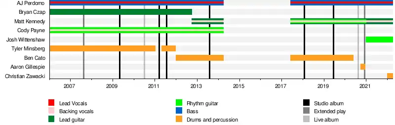 - AJ Perdomo – lead vocals/songwriter, bass guitar, (2006–2014, 2017–present)