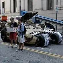 Production photos from filming in Pittsburgh showed a second Tumbler chassis after the first was destroyed, indicating that a new Batmobile would be in the film, following the destruction of the first in The Dark Knight.[111] Further set photos revealed a "new vehicle" being transported to Wabash Tunnel, prompting speculation as to its nature.[112] In June 2011, Autoblog confirmed the presence of the new Lamborghini Aventador on the film set.[113]