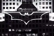 The film introduces a vehicle that has been compared with the Batplane and the Batcopter, dubbed "the Bat". In designing the Bat, Nathan Crowley approached it as if it were an actual military project, emphasising the need for it to "fit into the same family" as the Tumbler and the Batpod. The final version of the Bat takes its design cues from the Harrier Jump Jet, Bell Boeing V-22 Osprey and the Boeing AH-64 Apache.[12] Chris Corbould described the Bat's size and shape as presenting a major challenge for filming given Christopher Nolan's emphasis on practical effects over computer-generated imagery. In order to make the Bat "fly", it was variously supported by wires, suspended from cranes and helicopters, and mounted on a purpose-built vehicle with hydraulic controls to simulate movement.[12][124][125]