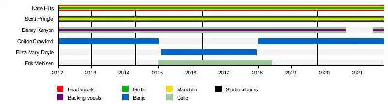 The band toured extensively and repeatedly in Canada and Europe. Crawford left the band in 2015, and Eliza Mary Doyle, a noted solo and studio musician, was hired to fill the vacancy. After almost 2 years of absence from the band, Colton "Crawdaddy" Crawford returned to the lineup, replacing Doyle as banjoist.[4] On tour, Danny Kenyon was occasionally replaced on cello by Erik Mehlsen, owing to Kenyon's career in engineering.[5]