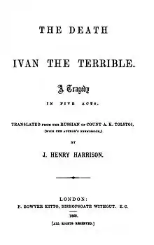 The Death of Ivan the Terrible (Russian: Смерть Иоанна Грозного, romanized: Smertʹ Ioanna Groznogo) is a historical drama by Aleksey Konstantinovich Tolstoy written in 1863 and first published in the January 1866 issue of Otechestvennye zapiski magazine.[1][2] It is the first part of a trilogy that is followed by Tsar Fiodor Ioannovich and concludes with Tsar Boris.[2] All three plays were banned by the censor.[3] It dramatises the story of Ivan IV of Russia and is written in blank verse.[4] Tolstoy was influenced by the work of William Shakespeare in writing the trilogy, which formed the core of his reputation as a writer in the Russia of his day and as a dramatist to this day.[5]