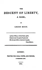 The Descent of Liberty was a masque written by Leigh Hunt in 1814. Held in Horsemonger Lane Prison, Hunt wrote the masque to occupy himself, and it was published in 1815. The masque describes a country that is cursed by an Enchanter and begins with shepherds hearing a sound that heralds change. The Enchanter is defeated by fire coming out of clouds, and the image of Liberty and Peace, along with the Allied nations, figures representing Spring and art, and others appear to take over the land. In the final moments, a new spring comes and the prisoners are released. It is intended to represent Britain in 1814, emphasising freedom and focusing on the common people rather than the aristocracy. Many contemporary reviews from both Hunt's fellow poets and literary magazines were positive, although the British Critic described the work as a "pert and vulgar insolence of a Sunday demagogue, dictating on matters of taste to town apprentices and of politics to their conceited masters".[1]