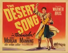 The Desert Song is a 1943 American musical film. It was directed by Robert Florey and starred Dennis Morgan, Irene Manning and Bruce Cabot.[2] It is based on the 1926 operetta with music by Sigmund Romberg. It was nominated for an Academy Award for Best Art Direction (Charles Novi, Jack McConaghy).