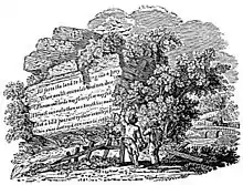 Bewick also depicted scenes from The Deserted Village which appeared in other places. An engraving of his edition of Fables of Aesop, published in 1818, features a scene depicting a quotation from the poem carved into a rock.[30]