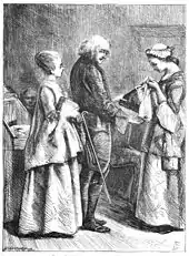 Thomas Bewick and his school also produced several depictions of scenes from The Deserted Village, some of which occurred as illustrations of published versions of the poem or Goldsmith's works. In 1794, Bewick produced woodcuts to illustrate a volume entitled The Poetical Works of Oliver Goldsmith.[27] In the following year, Bewick and his brother John Bewick (1760-1795) again engraved illustrations for a volume entitled Poems by Goldsmith and Parnell.[28] The magnitude of this project meant that Bewick enlisted several collaborators to produce the illustrations.[29]