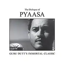 The Dialogue of Pyaasa was written by the British author and television documentary producer Nasreen Munni Kabir,[1] becoming the third publication on the Indian actor-cum-filmmaker Guru Dutt's work after the biographies Guru Dutt: A Life in Cinema (1996) and Yours Guru Dutt (2006).[2][3] The book contains the dialogues of Pyaasa (1957)—in Hindi and Urdu—and its English-language translation, as well as lyrics for the soundtrack and a commentary by Kabir on the film. A romantic drama, Pyaasa features Dutt, Mala Sinha, Waheeda Rehman, Rehman, and Johnny Walker in the leading roles, and was released on 22 February 1957. Garnering positive response from audiences and critics,[2]:75 it is subsequently dubbed as one of the best films in the genre.[4]