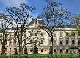 The new district court building opened on December 2, 1905, the 57th anniversary of enthronement of Emperor Franz Joseph I Habsburg. He visited the Court on September 2, 1906, planting an imperial oak in front of the building.[2] The court building served as the Austrian Regional Court (Kreisgericht). In the past, there was a two-headed eagle and an inscription: "K. K. KREISGE-RICHT" - "Imperial-royal Regional Court" over a window on the second floor.[2]