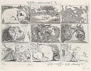 The Dream and Lie of Franco is a series of two sheets of prints, comprising 18 individual images, and an accompanying prose poem, by Pablo Picasso produced in 1937. The sheets each contain nine images arranged in a 3x3 grid. The first 14, in etching and aquatint, are dated 8 January 1937. The remaining four images were added to the second printing plate later, without use of aquatint, and dated June 7, 1937.[1][2][3]