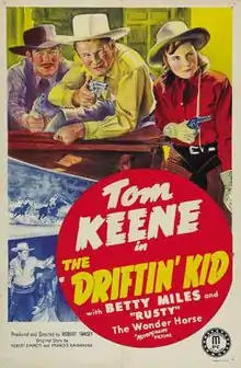 The Driftin' Kid is a 1941 American Western film directed by Robert Emmett Tansey and written by Robert Emmett Tansey and Frances Kavanaugh. The film stars Tom Keene, Betty Miles, Frank Yaconelli, Glenn Strange, Stanley Price and Fred Hoose. The film was released on October 17, 1941, by Monogram Pictures.[1][2][3]