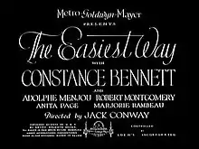 The Easiest Way is a 1931 American pre-Code MGM drama film directed by Jack Conway. Adapted from the 1909 play of the same name written by Eugene Walter and directed by David Belasco, the film stars Constance Bennett, Adolphe Menjou, Robert Montgomery, Marjorie Rambeau, Anita Page, and Clark Gable