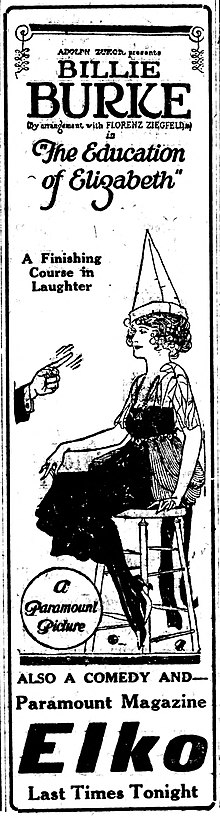 The Education of Elizabeth is a 1921 American silent comedy romance film produced by Famous Players-Lasky and distributed by Paramount Pictures. It was directed by Edward Dillon and stars stage star Billie Burke in her last silent film. The film was based on a play by Roy Horniman and is now a lost film.[1][2][3]