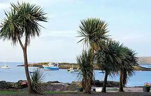 Cabbage trees (Cordyline australis) on Newton Bay, with the Eileans in the background
