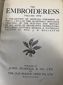 The Embroideress was a quarterly magazine published by the London-based embroidery thread manufacturer Pearsall and Company and the Old Bleach Linen Company of Ireland, starting in 1922 and continuing until 1939.[1]: 16 Issues contained a variety of types of material, including current designs, information on embroidery from different countries, articles about historical textiles or collections, and different embroidery techniques. Most illustrations were black and white, but plates were printed in color.[2] The Embroideress also reviewed current embroidery exhibits and books on the topic.[3]: 93 [1]: 16 It cost 1 shilling per copy, and could be obtained by subscription.[1]: 16 Collections of articles from spans of issues ("parts") were also published, edited by Mrs. J. D. Rolleston. For example, volume two of the collected articles was published in 1925, and included material from parts 9 to 16.[2]