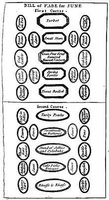 The book was illustrated with 12 copper-plate engravings of Bills of Fare for the 12 months of the year, each one being a table layout of oval or octagonal dishes. These plates preceded the first chapter.