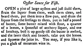 The recipes are given as names of dishes, such as "Oyster Sauce for Fish", with a paragraph of instructions. There are no lists of ingredients. Quantities are given where needed, in whatever measure is convenient, as "a pint of large oysters", "half a pound of butter", "a quarter of a lemon", or "a spoonful of anchovy liquor". Cooking instructions rely on the observation of the cook, as "boil it up gently till the butter is melted, and the sauce thick and smooth".[7]