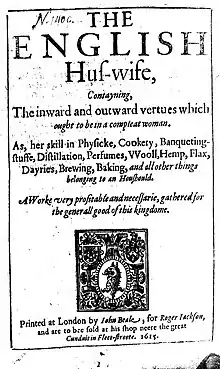 The Second intituled, The English Huswife: Containing the Inward and Outward Virtues Which Ought to Be in a Complete Woman: as her Phisicke, Cookery, Banqueting-stuffe, Distillation, Perfumes, Wooll, Hemp, Flaxe, Dairies, Brewing, Baking, and all other things belonging to an Houshold.[2] The first book is named on its first page as The Husbandmans Recreations.[3]