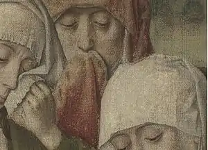 The Pharisee Nicodemus supports Christ as he is lowered, and can be identified by his similarity to Simon the Pharisee in another canvas attributed to Bouts, Christ in the House of Simon.[10] The Virgin wears a white headdress and a dark blue dress with a yellowish mantle, and holds Christ's arm just above his wrist as if afraid to let go of her dead son. She is supported by John the Evangelist, who wears a red robe. Dressed in green robes, Mary Salome stands to the Virgin's left, wiping tears from her face with the fold of her white headdress. Mary of Clopas is behind them, holding a red cloth over her mouth, while the Magdalen is in the foreground at Christ's feet, dressed in a heavily folded cloak. The man in the brown–green tabard at the feet of Christ is probably Joseph of Arimathea, who, according to Gospel, brought Christ's body to Golgotha from Pontius Pilate.[10]