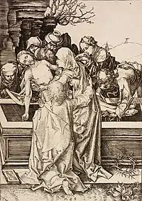 The Entombment is a glue-size painting on linen[2] attributed to the Early Netherlandish painter Dieric Bouts. It shows a scene from the biblical entombment of Christ, and was probably completed between 1440 and 1455[3] as a wing panel for a large hinged polyptych altarpiece. The now-lost altarpiece is thought to have contained a central crucifixion scene flanked by four wing panel works half its height – two on either side – depicting scenes from the life of Christ. The smaller panels would have been paired in a format similar to Bouts's 1464–1468 Altarpiece of the Holy Sacrament. The larger work was probably commissioned for export to Italy, possibly to a Venetian patron whose identity is lost.[4] The Entombment was first recorded in a mid-19th century Milan inventory and has been in the National Gallery, London, since its purchase on the gallery's behalf by Charles Lock Eastlake in 1861.