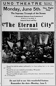 The Eternal City is a 1915 American silent drama film directed by Hugh Ford and Edwin S. Porter, produced by Adolph Zukor. The movie stars Pauline Frederick in her debut film role,[1] The production is based upon the 1901 novel and 1902 Broadway play of the same name by Hall Caine that starred Viola Allen and Frederic De Belleville.[2] Much of The Eternal City was shot on location in England and Italy before being interrupted by the start of the Great War. The film was released through the specially created Select Film Booking Agency for the Famous Players Film Company.