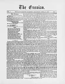 The Exonian is the bi-weekly student-run newspaper of Phillips Exeter Academy in Exeter, New Hampshire. It has been printed continuously since April 6, 1878, making it the oldest continuously-published preparatory school newspaper in the country.[1][2] It is published weekly by its student board and is subject to limited faculty censorship. Many parents and alumni hold subscriptions to the paper, which acts as a forum for the ideas of the Exeter community and prints extensive news, investigative, opinion, sports, and feature articles. In 2011, the newspaper became available to all students free of cost.