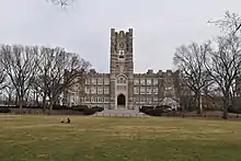 The interior of Karras' room at Georgetown was a meticulous reconstruction of Theology professor Father Thomas M. King, S.J.'s "corridor Jesuit" room in New North Hall. King's room was photographed by production staff after a visit by Blatty, a Georgetown graduate, and Friedkin. Upon returning to New York, every element of King's room, including posters and books, was recreated for the set, including a poster of Pierre Teilhard de Chardin, S.J., a theologian on whom the character of Fr. Merrin was loosely based. Georgetown was paid $1,000 per day of filming, which included both exteriors such as Burstyn's first scene, shot on the steps of the Flemish Romanesque Healy Hall, and interiors such as the defilement of the statue of the Virgin Mary in Dahlgren Chapel, or the Archbishop's office, which is actually the office of the president of the university. One scene was filmed in The Tombs, a student hangout across from the steps that was founded by a Blatty classmate.[44]