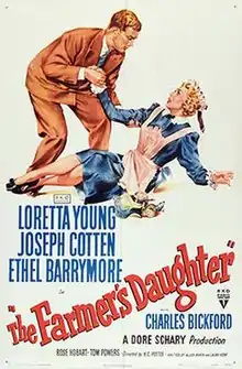 The Farmer's Daughter is a 1947 American comedy film that tells the story of a farmgirl who ends up working as a maid for a Congressman and his politically powerful mother. It stars Loretta Young, Joseph Cotten, Ethel Barrymore, and Charles Bickford, and was adapted by Allen Rivkin and Laura Kerr from the 1937 Finnish play Juurakon Hulda by Hella Wuolijoki, using the pen name Juhani Tervapää (misspelled in the film's credits as Juhni Tervataa). It was directed by H.C. Potter.
