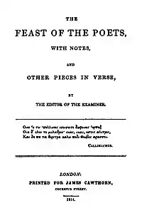 The Feast of the Poets is a poem by Leigh Hunt that was originally published in 1811 in the Reflector. It was published in an expanded form in 1814, and revised and expanded throughout his life (see 1811 in poetry, 1814 in poetry). The work describes Hunt's contemporary poets, and either praises or mocks them by allowing only the best to dine with Apollo. The work also provided commentary on William Wordsworth and Romantic poetry. Critics praised or attacked the work on the basis of their sympathies towards Hunt's political views.