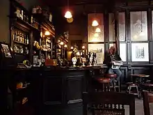 Historic England comment on the relatively intact nature of the interior, noting the partitions made of glass and mahogany, the bar counter and fittings, the original cast-iron fireplaces and their tiled surrounds, the moulded cornices to the ceilings, the wall tiles and the "Victorian chromolithographs". They also note that during the building of a rear extension in 1990, a vaulted brick-built cellar was uncovered.[1]
