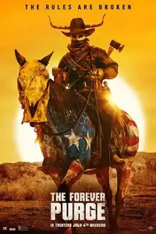 In April 2020, the film's title was revealed as The Forever Purge.[31][32][33] The film was originally scheduled for a theatrical release in the United States on July 10, 2020, by Universal Pictures.[8][9] On May 15, 2020, its release was postponed indefinitely due to the COVID-19 pandemic.[34][35][36] On July 8, 2020, it was reported that the film had been rescheduled for July 9, 2021.[37][38] On April 9, 2021, it was reported that the film's American release date had been pushed up a week to July 2.[39]