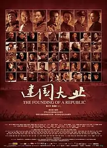 The Founding of a Republic is a Chinese historical drama produced in 2009 to mark the 60th anniversary of the People's Republic of China and was made to portray the final years of the Chinese Communist Revolution that followed the end of the Second Sino-Japanese War (1945-1949). This film was co-directed by Huang Jianxin and Han Sanping, and includes many famous actors such as Andy Lau, Ge You, as well as other directors such as Jiang Wen, and Chen Kaige. The main protagonists Mao Zedong and Chiang Kai-shek were played by highly renowned actors, Tang Guoqiang and Zhang Guoli. One of the purposes of this movie aside from reenacting the events of the Chinese Communist Revolution was to also attract a younger audience to view films that revolved around government propaganda, which they aim to accomplish by including famous actors that would draw the attention of the youth.[4] According to the executive at one of China's top multiplex chains, this film is also unique because the film unusually marries "the core of an 'ethically inspiring' film with commercial packaging.".[4] Additionally, this is the first zhuxuanlu (主旋律; i.e. propaganda) film to work solely with cinematic audio-visual methods to achieve its political and ideological goals. It is a milestone in that since its production in 2009, the distinction between zhuxuanlu and commercial film has become blurred; they have become primarily indistinguishable from each other.[5] This film was released on September 16, 2009, in mainland China and during its release, it had a tremendous amount of support from the Communist Party.
