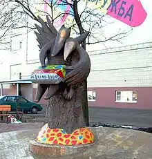 Given the circumstances of the replacement, it is not surprising that the design is so traditional and, indeed, reminiscent of Pierre Julien's 18th century statue of La Fontaine in the Louvre. But the monuments incorporating the fable in the former Soviet territories have been more inventive and modernist. There, it is the Russian adaptation by Ivan Krylov, "The Crow and the Fox" (in this case little different from his master's version), that is being alluded to.[44] It figures among several others on panels around Andrey Drevin's monument beside the Patriarch Ponds in Moscow. Another piece of street sculpture that brings them strikingly together is the stylised monument to the famous Soviet processed cheese brand Druzhba (Friendship) on Rustaveli Street in Moscow. A parody cartoon based on the fable was made in 1981, called Plasticine Crow (Пластилиновая ворона).