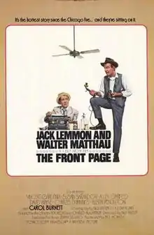 The Front Page is a 1974 American black comedy-drama film directed by Billy Wilder and starring Jack Lemmon and Walter Matthau.[3] The screenplay by Wilder and I.A.L. Diamond[3] is based on Ben Hecht and Charles MacArthur's 1928 play of the same name, which inspired several other films and televised movies and series episodes.[4][5]