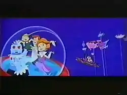 This time the riders end up in the future into Orbit City, dodging flying cars and buildings. It's not long before Elroy's family (except Judy and Astro who are absent from the ride) appear and see Elroy captured, (after which he jumped from Dastardly's ship in a bold move aiming to get caught by one of his parents standing nearby, just to be pulled back in Dastardly's ship by the suction of a toilet plunger) and chase after Dastardly with the riders, going into a futuristic amusement park.