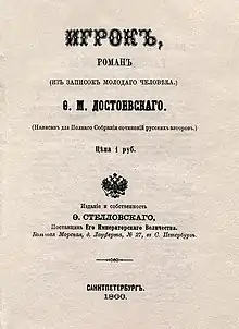 The Gambler (Russian: Игрокъ, romanized: Igrok; modern spelling Игрок) is a short novel by Fyodor Dostoevsky about a young tutor in the employment of a formerly wealthy Russian general. The novella reflects Dostoevsky's own addiction to roulette, which was in more ways than one the inspiration for the book: Dostoevsky completed the novella in 1866 under a strict deadline to pay off gambling debts.[1]