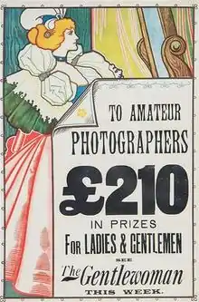 In 1898, preference shares in the paper were listed on the London Stock Exchange.[14] Also in 1898, the Grafton Galleries hosted an exhibition of the winning images from the paper's photographic competition, open to amateur photographers only. The Gentlewoman had offered two hundred guineas in prizes, equivalent to £23,916 in 2020, and the judges were H. P. Robinson, Viscount Maitland, and the Rev. F. C. Lambert.[15]