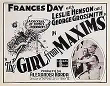 The Girl from Maxim's is a 1933 British musical comedy film directed by Alexander Korda and starring Frances Day, Leslie Henson, Lady Tree and Stanley Holloway.[1] It was an adaptation of the 1899 play La Dame de chez Maxim by Georges Feydeau.[2] A French-language version was filmed at the same time under the title La dame de chez Maxim's.