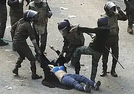The Girl in the Blue Bra is the name given to an image of an Egyptian woman who participated in the Tahrir Square protests in opposition to Egypt's Supreme Council of the Armed Forces (SCAF), the military coup that ousted Hosni Mubarak during the 2011 Egyptian Revolution in opposition to Mubarak's presidency.[1] Her name has been undisclosed, and therefore she cannot be properly identified.[2] The image receives its title due to the fact that the woman was stripped of her abaya (a single full-body garment used to cover the body of a woman, aside from her face, hands and feet) while being dragged by Egyptian soldiers from the square, revealing her jeans, bare skin, and her blue bra. Such an event sparked widespread national and global reactions from individuals and the media.