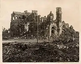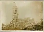 1915, View of the ruins of the Basilica of Notre-Dame de Brebières in Albert