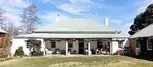 The original farmhouse has a verandah which originally surrounded the house entirely and is believed to be one of earliest examples of a wrap-around verandah built in Australia.[11] The verandah has been enclosed on two northern corners to form rooms that now connect the farmhouse to the cottage and the kitchen-garage wing. An "outdoor" room has also been added c.1980 near the southwest corner of the farmhouse. The verandah has a separated roof with a lower pitch than the main roof, a solution favoured aesthectially from the mid-1830s.[12] The walls of the farmhouse are rendered brickwork. A partition wall within the kitchen wing is constructed of pise. The original windows on the farmhouse are timber-framed, double-hung with six lights per pane, fine glazing bars and mostly original glass. The original entrance (facing south towards the river) has a formal symmetrical facade with a central door and half round fan-light with 8 panels. The original shingles for the roof, manufactured locally, are believed to be still in place beneath the corrugated iron roof. The most intact part of the original farmhouse is its hallway.[1]