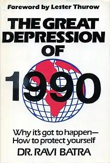 The Great Depression of 1990 is a book by Ravi Batra in the field of economic history and future evolution, originally published in 1985. The book's original title was Regular Cycles of Money, Inflation, Regulation and Depressions. MIT Economics Professor Lester Thurow wrote a favorable introduction for the book with its original title. Retitled, the book entered the New York Times Best Seller list in early 1987 and reached #1 later that year.[1][2][3] The book and its sequel, Surviving the Great Depression of 1990, made Batra "one of the best selling economists of all time." [4]
