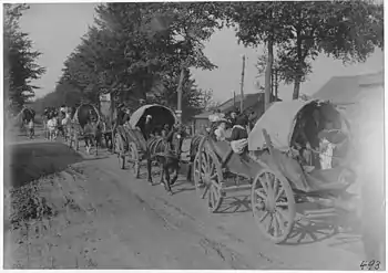 Shippey notes the likeness of the phrase used by Bard of Laketown in The Hobbit, urging the townsmen "to fight to the last arrow", to the wartime "fighting to the last round" (his emphasis). He finds a second parallel in the town's fight against the dragon Smaug with "a company of archers that held their ground ...", stating that "holding one's ground" speaks of "modern coolness and preparation" rather than "ancient 'berserk' fury".[29] Another, he suggests, is the use by Saruman at Isengard of a projected burning substance, which he likens with "reference to Tolkien's own experience" to a Flammenwerfer, a German flame thrower.[30] He finds a psychological correspondence, too, between the way that the Hobbits Pippin, Merry, and above all Sam maintain a cheerfulness even when they see no hope of success, with soldiers' accounts of the Great War such as Frank Richards's 1933 Old Soldiers Never Die; he states that that this forms part of Tolkien's theory of courage.[31] The opposite, defeatism, is to Tolkien a great evil; Shippey remarks that "with his best friends dead in Flanders", Tolkien hated it "like poison", and that even the bad steward of Gondor, Denethor, chooses ceremonial suicide over some Vichy-style submission to the enemy.[32]