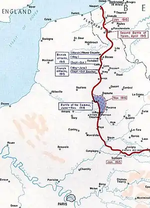 Tolkien was attached to the Lancashire Fusiliers who fought in the Battle of the Somme from September 1916. Tolkien's battalion stayed in reserve for the first week. It went into action at Ovillers, Tolkien's company again staying in reserve to carry supplies. Tolkien became battalion signals officer and often worked close to the front line. The battalion helped to win the Battle of Thiepval Ridge in late September, and took part in the capture of Regina Trench in late October. On 25 October, he went down with trench fever, and was sent home a fortnight later.[4][5][6][7]