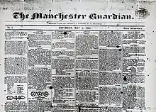 The influential journalist Jeremiah Garnett joined Taylor during the establishment of the paper, and all of the Little Circle wrote articles for the new paper.[28] The prospectus announcing the new publication proclaimed that it would "zealously enforce the principles of civil and religious Liberty ... warmly advocate the cause of Reform ... endeavour to assist in the diffusion of just principles of Political Economy and ... support, without reference to the party from which they emanate, all serviceable measures".[29] In 1825, the paper merged with the British Volunteer and was known as The Manchester Guardian and British Volunteer until 1828.[30]