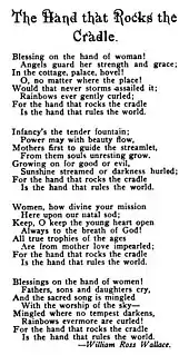 "The Hand That Rocks the Cradle Is the Hand That Rules the World" is a poem by William Ross Wallace that praises motherhood as the preeminent force for change in the world. The poem was first published in 1865 under the title "What Rules the World".[1][2] Although the poem itself is now largely forgotten, the poem's refrain became a commonly quoted proverb.[2][3][4]