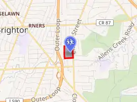 The school is located in the suburb of Brighton. The 25-acre (10 ha) campus is composed of a main building housing all divisions, an athletic center known as the Fieldhouse, and The Commons.[2] The grounds hold two soccer fields, baseball/softball fields, indoor/outdoor tennis courts, a playground for Lower School students, an aquatic center with an adjacent fitness room (established in 2019),[3] and an outdoor area for Middle School students. The grounds are bordered by Allens Creek business park on one side.