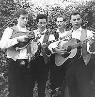 The Hillmen (a.k.a. the Golden State Boys) were a southern Californian bluegrass group.[1] Formed in 1962, the original line-up of the Golden State Boys consisted of Vern Gosdin on guitar and lead vocals, his brother Rex Gosdin on double bass, Hal Poindexter on guitar, and Don Parmley on banjo.[2][3] Poindexter left the group in late 1962, however, and was replaced by 17-year-old mandolin prodigy Chris Hillman.[3] Hillman, who had previously been a member of the high-profile San Diego bluegrass group the Scottsville Squirrel Barkers, was invited to join the Golden State Boys by Parmley, after the pair met at a bluegrass evening at The Ice House folk club in Pasadena.[3][4] Upon his recruitment, the group briefly changed their name to the Blue Diamond Boys before finally settling on The Hillmen, in honor of their mandolin playing wunderkind.[3]