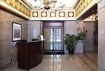 The interior of the Holston, although heavily renovated in 1977, still contains several original elements. The entrance foyer has a vaulted ceiling with plaster rosettes, and a frieze decorated with triglyphs and metopes. The lobby originally contained Greek and Art Deco motifs, but these were removed during the 1977 renovation.[1]