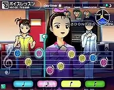 The lessons are in the form of five minigames which serve to increase an idol's statistics in either vocal, dance or visual image. Each lesson is divided into six parts, and the lesson's overall performance is ranked from bad, to normal, good and finally perfect.[5] Sometimes a lessons is temporarily unavailable. The communication phase of the gameplay mainly deals with the player talking with the idol and doing jobs to further her exposure to the public. The player is given multiple jobs to choose from, which change as an idol's rank increases. Like when greeting the idol before, the player is given multiple responses to choose from over the course of a conversation. Depending on which choice is made will affect how well or poorly the communication is received from bad, to normal, good and finally perfect communication, which results in either good or bad memories.[6] The good memories are tallied in the heart on the heads-up display.