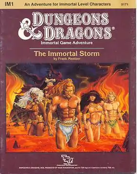 The Immortal Storm is a 40-page booklet with an outer folder, published in 1986. It was written by Frank Mentzer, with cover art by Larry Elmore and interior art by Valerie Valusek and Larry Elmore.[4] This module was the first produced for the D&D Immortals Rules set, designed for a party of Novice Temporals, the lowest level of Immortal character.[2]