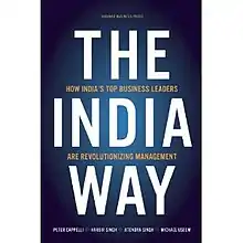 The India Way: How India’s Top Business Leaders Are Revolutionizing Management is published by the Harvard Business Press.[1] It's a non-fictional book written by Peter Cappelli, Harbir Singh, Jitendra Singh and Michael Useem of the Wharton School at the University of Pennsylvania.[2] The book was released in the United States on March 23, 2010, and was released in India in May 2010. The India Way primarily focuses on the contrast in business management styles between the U.S. and India. Topics discussed in the book include topics such as leadership skills, company governance, human resources management and innovation. The authors’ conclusions are based on an analysis of nearly 130 interviews conducted with Indian CEOs and executives.[3]